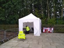 Early start to a bright sunny morning, gaining access to the site at around 8:45. Derry (2E0RRF), Stefan M0OSL, Ian (G8VXG) and Connor (2E0EIY) had made light work of setting up the pop up gazebo, the mast for the collinear and the centre pulley for the trapped dipole.
